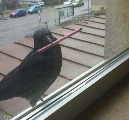 You’ve all just like, completely skipped over the possibility that this crow has seen people using pens in this room, found one, and is trying to return it. There’s been videos of crows picking up sweet wrappers and stuff and placing them in bins after seeing humans put their litter in bins. I really do believe that this crow is trying to return the pen and that is ADORABLE AS HELL.