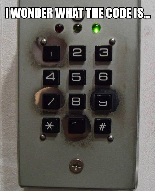 No, no, no. Don’t base your deductions of psychology. Let’s talk chemistry. When you first press a button, there’s more of the natural oils on your skin, and therefore it wears down the numbers on the keys faster. Obviously 0 is the first one, then. Try 0791 first.