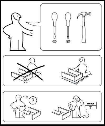 Top: “These are the tools you probably have at home. Forget about them; they are not going to help you today. Welcome to the IKEA zone. May God have mercy on your soul.”