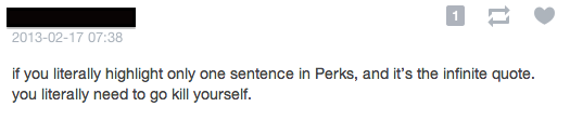 highlighting a well-known quote from a book is totes grounds for telling people to kill them selves ladykarasu1 June 2, 2014December 6, 2018 Published by ladykarasu1 View all posts by ladykarasu1 Published June 2, 2014December 6, 2018