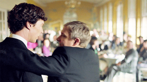 I’ve pondered this shot since TSOT aired. I kept wondering why we were shown the hug from this angle. At first I thought it had to do with John’s private nature, especially his private feelings about Sherlock: so private he can’t admit them to his therapist after Sherlock’s “death,” so private he makes sure Mrs. Hudson’s not watching before he touches Sherlock’s headstone. Here, he hides his face behind Sherlock’s before hugging him, and we get a private glimpse of his face full of adoration for his friend, but the guests do not.