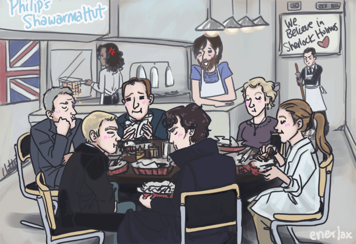 ladykarasu1 Uncategorized August 27, 2014December 6, 2018 1 Minute enerjax: Valeria2067: John, Sherlock, Mycroft, Lestrade, Moriarty, Moran, Anderson, Donovan, and Mary all sitting sitting around a table and silently eating shwarma. YES. Share this: Share on X (Opens in new window) X Share on Facebook (Opens in new window) Facebook Like Loading... Related Published by ladykarasu1 View all posts by ladykarasu1 Published August 27, 2014December 6, 2018