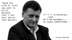 ladykarasu1 Uncategorized October 17, 2014December 6, 2018 1 Minute skulls-and-tea: — The Ten Commandments for Screenwriters [x] from Adventures in the Screen Trade, by William Goldman [x] Steven Moffat quote taken from PBS Live Chat transcript, May 2012: [x] More quotes from Moffat on (screenwriting guru/novelist/writer of The Princess Bride) William Goldman: [x] Share this: Share on X (Opens in new window) X Share on Facebook (Opens in new window) Facebook Like Loading... Related Published by ladykarasu1 View all posts by ladykarasu1 Published October 17, 2014December 6, 2018