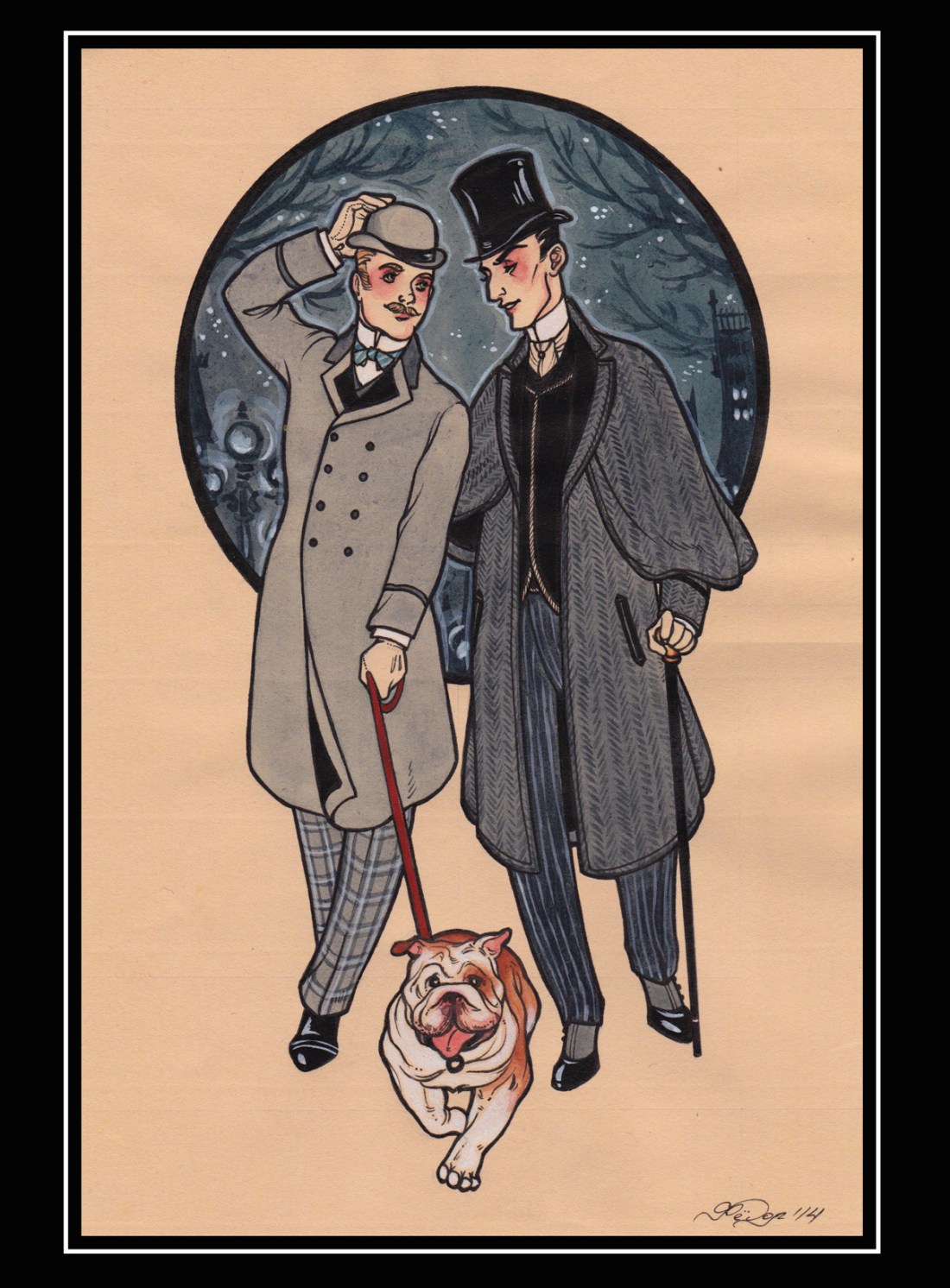 So dapper, so dashing! It’s Holmes and Watson taking Gladstone for a walk. It is also the third in a series of three postcards by the amazingly talented fyodorpavlov who will be attending Sherlock Seattle 2015 as a guest panelist and artist. You MUST come and see his gorgeous set of Sherlock Holmes paper dolls which he will be selling at the convention!