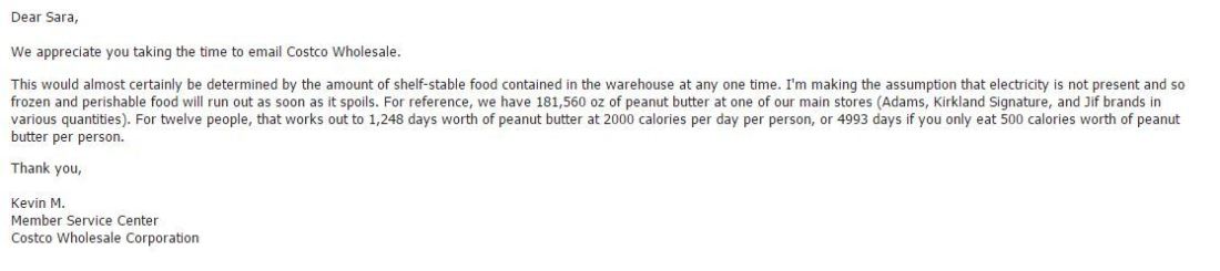 I emailed Costco asking how long 12 people would be able to survive in a post-apocalyptic situation. This was their response.