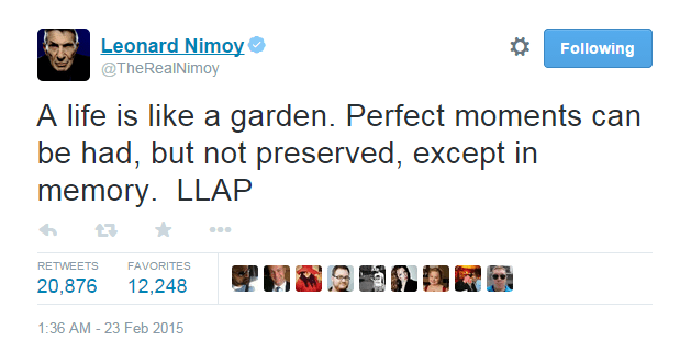 ladykarasu1 Uncategorized March 2, 2015December 6, 2018 1 Minute washingtonpost: Leonard Nimoy’s last tweet. Share this: Share on X (Opens in new window) X Share on Facebook (Opens in new window) Facebook Like Loading... Related Published by ladykarasu1 View all posts by ladykarasu1 Published March 2, 2015December 6, 2018