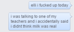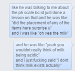 presented to you in facebook chat format because i didnt want to type it out again: the time i fucked up and told my chemistry teacher i didnt believe in milk