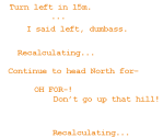 ladykarasu1 Uncategorized March 24, 2015December 6, 2018 1 Minute syblatortue: even the sassy NAVIGATOR 2000 cannot make him unlost. Share this: Share on X (Opens in new window) X Share on Facebook (Opens in new window) Facebook Like Loading... Related Published by ladykarasu1 View all posts by ladykarasu1 Published March 24, 2015December 6, 2018