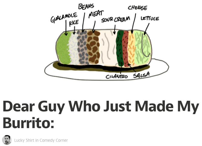 Humans also don’t eat burritos like fucking corn on the cob. Like a fucking typewriter from one end to the other a little at a time and then DING next line. But today I wish I had tried that. Because at least THEN I would be able to eat some rice, then beans, then be all like HEY BEANS I’LL BE RIGHT BACK JUST GOING OVER HERE TO THE GUACAMOLE FOR A SECOND.