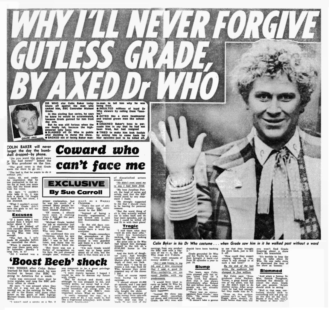 Not only that, but when Michael Grade had fired Colin and was trying to cancel Doctor Who, he was fucking Colin’s ex-wife.