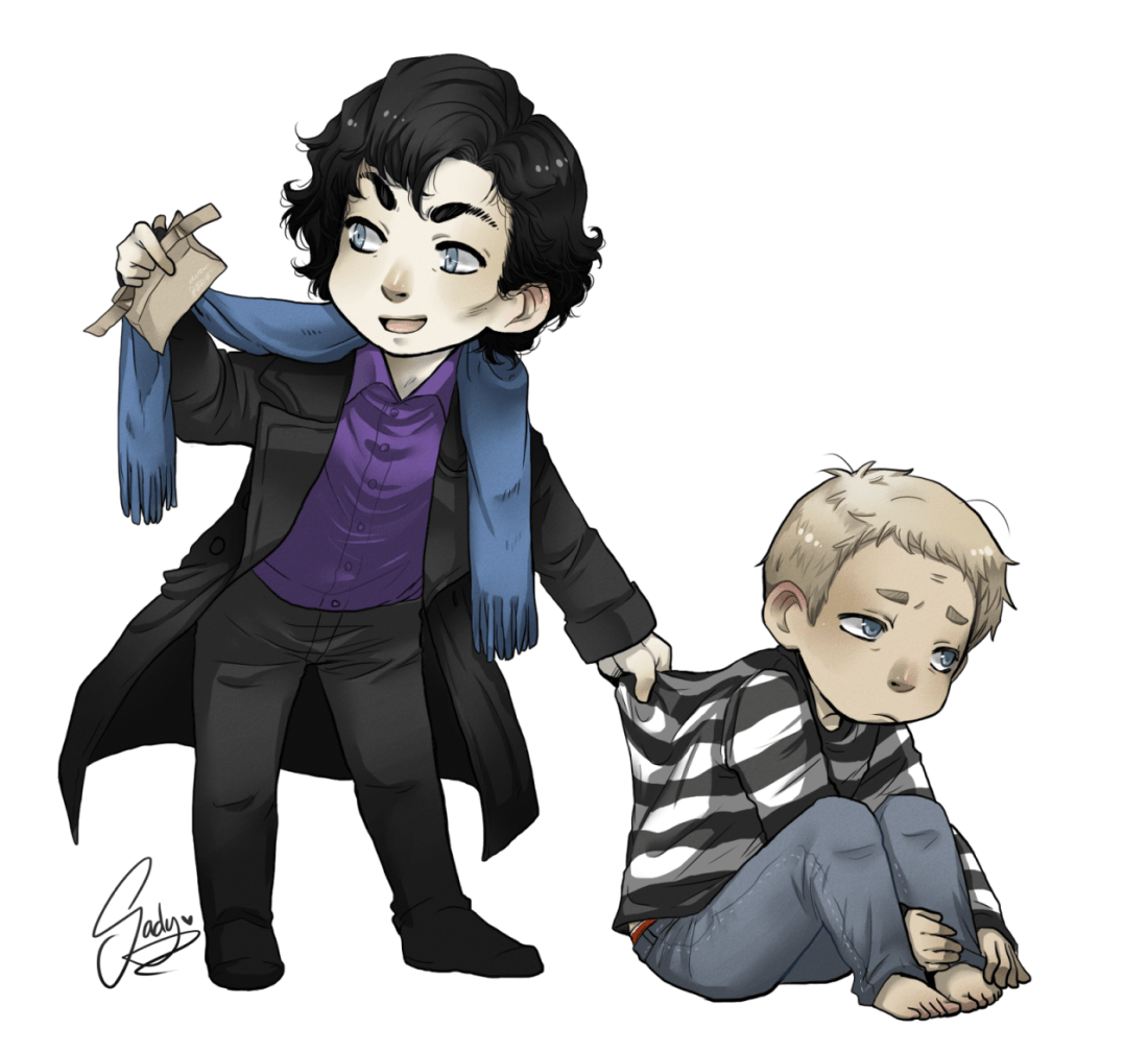 look at this adorable drawing Sadynax made for me 😀 eeeeeh (I wanted a tired John and a ready to go Sherlock and I got an extra touch of red pants hahaha)